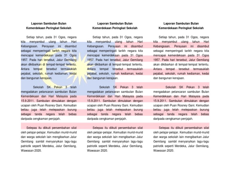 Hari hari kemer kemerde dekaa kaan n nega negara ra yang yang kita kita sambu sambutt setia setiap p tahun tahun mempu mempuny nyai ai keba kebaika ikan. Related posts to contoh karangan laporan sambutan hari kemerdekaan di sekolah contoh karangan laporan sambutan hari kemerdekaan di sekolah 2018 06 18t16:35:00 07:00 rating: Bertempat di bagan pulau pinang. Perjuangan telah dilakukan dengan gigih. Sekolah menengah kebangsaan seksyen 7.