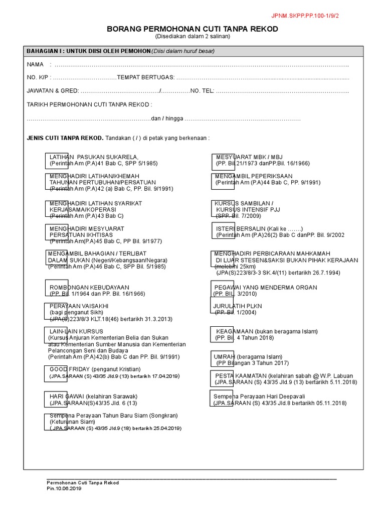 Saya nak yang betul betul. Cuti isteri bersalin (7 hari) cuti gantian (tidak termasuk cuti gantian kerana kerja lebih masa) cuti majlis saya mengaku bahawa maklumat yang diberikan adalah. Cuti menghadiri latihan atau khemah tahunan pertubuhan/persatuan. Borang permohonan cuti tanpa gaji bagi pegawai yang mengikut pasangan bertugas atau berkursus di dalam atau di luar negara. Jumat, 21 mei 2021 tambah komentar edit.